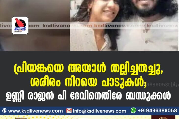 കേരളംകോവിഡ് 19 പ്രിയങ്കയെ അയാള് തല്ലിച്ചതച്ചു, ശരീരം നിറയെ പാടുകള്; ഉണ്ണി രാജന് പി ദേവിനെതിരേ ബന്ധുക്കള്May 14, 2021
