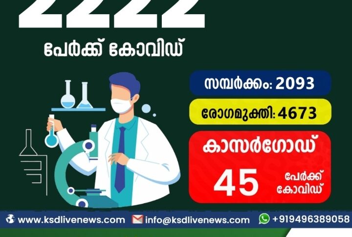 കേരളംകോവിഡ് 19 സംസ്ഥാനത്ത് ഇന്ന് 2222 കോവിഡ് സ്ഥിരീകരിച്ചു. സമ്പർക്കം വഴി 2093 പേർക്കും ; ആശ്വാസമായി 4673 പേർക്ക് രോഗമുക്തി ; കാസർഗോഡ് ജില്ലയിൽ 45 പേർക്ക് പുതിയ കോവിഡ് കേസുകൾ ; മരണം 03March 3, 2022