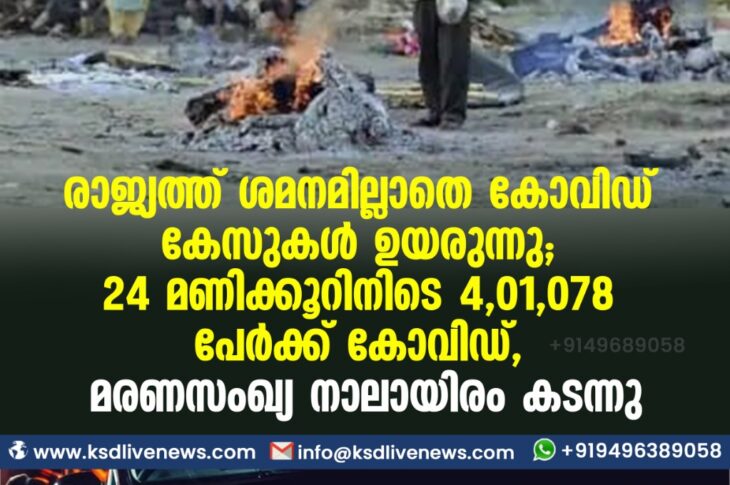 കോവിഡ് 19ദേശീയം രാജ്യത്ത് ശമനമില്ലാതെ കോവിഡ് കേസുകൾ ഉയരുന്നു ; 24 മണിക്കൂറിനിടെ 4,01,078 പേർക്ക് കോവിഡ് , മരണസംഖ്യ നാലായിരം കടന്നുMay 8, 2021