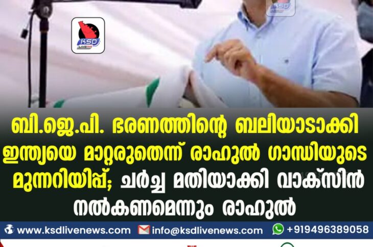 കോവിഡ് 19ടെക് ബി.ജെ.പി. ഭരണത്തിന്റെ ബലിയാടാക്കി ഇന്ത്യയെ മാറ്റരുതെന്ന് രാഹുൽ ഗാന്ധിയുടെ മുന്നറിയിപ്പ്;ചര്ച്ച മതിയാക്കി വാക്സിന് സൗജന്യമായി നല്കണമെന്നും- രാഹുല്April 26, 2021