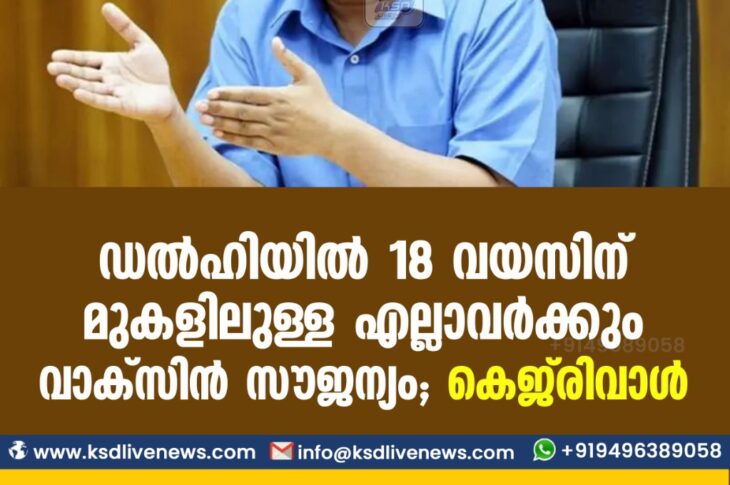 കോവിഡ് 19ദേശീയം ഡല്ഹിയില് 18 വയസിന് മുകളിലുള്ള എല്ലാവര്ക്കും വാക്സിന് സൗജന്യം – കെജ്രിവാള്April 26, 2021