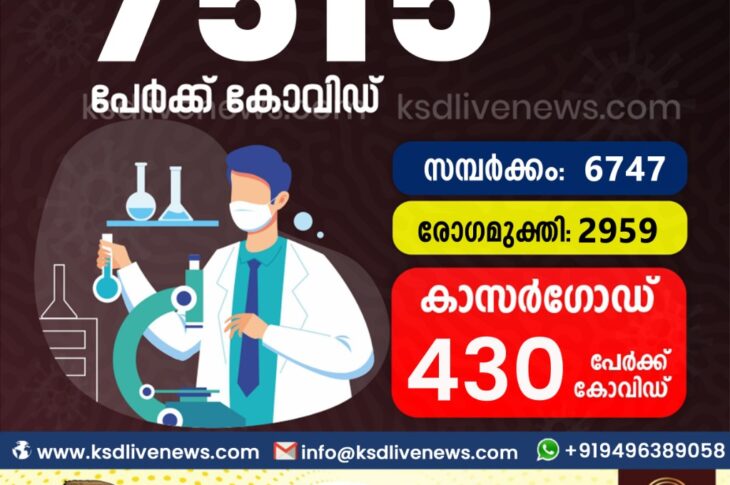 പിടിവിടാതെ കോവിഡ്; ഉയർന്ന് പ്രതിദിന കണക്ക് ;സംസ്ഥാനത്ത് ഇന്ന് 7515 പേർക്ക് കോവിഡ് സ്ഥിരീകരിച്ചു. സമ്പർക്കം വഴി 6747 പേർക്കും ; ആശ്വാസമായി 2959 പേർക്ക് രോഗ മുക്തിയും ; കാസർഗോഡ് ജില്ലയിൽ 430 പേർക്ക് പുതിയ കോവിഡ് കേസുകൾ ; മരണം 20