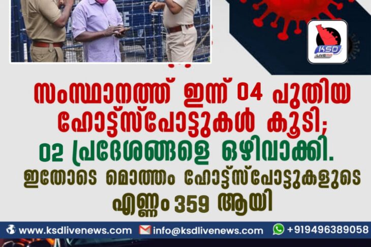 കേരളംകോവിഡ് 19 സംസ്ഥാനത്ത് ഇന്ന് 02 പുതിയ ഹോട്ട്സ്പോട്ടുകള് കൂടി; 04 പ്രദേശങ്ങളെ ഒഴിവാക്കി. ഇതോടെ മൊത്തം ഹോട്ട്സ്പോട്ടുകളുടെ എണ്ണം 359 ആയി.April 4, 2021