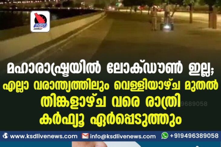 കോവിഡ് 19ദേശീയം മഹാരാഷ്ട്രയിൽ ലോക്സ്ഡൗൺ ഇല്ല ; എല്ലാ വരാന്ത്യത്തിലും വെള്ളിയാഴ്ച മുതൽ തിങ്കളാഴ്ച വരെ രാത്രി കർഫ്യൂ ഏർപ്പെടുത്തുംApril 4, 2021