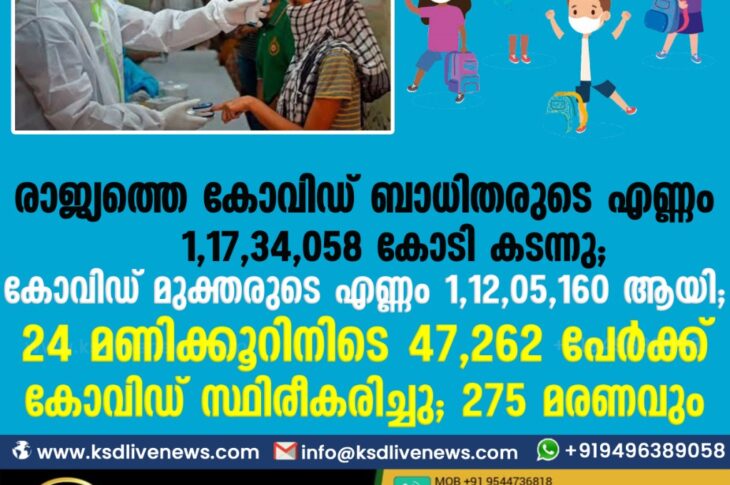 കോവിഡ് 19ദേശീയം രാജ്യത്തെ കോവിഡ് ബാധിതരുടെ എണ്ണം 1,17,34,058 കടന്നു ; കോവിഡ് മുക്തരുടെ എണ്ണം 1,12,05,160 ആയി;24 മണിക്കൂറിനിടെ 47,262 പേർക്ക് കോവിഡ് സ്ഥിരീകരിച്ചു ; 275 മരണവുംMarch 24, 2021