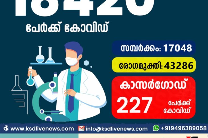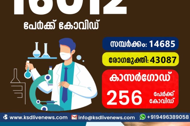 കോവിഡ് കുറയുന്നു; സംസ്ഥാനത്ത് ഇന്ന് 16012 കോവിഡ് സ്ഥിരീകരിച്ചു. സമ്പർക്കം വഴി 14685 പേർക്കും ; ആശ്വാസമായി 43087 പേർക്ക് രോഗമുക്തി ; കാസർഗോഡ് ജില്ലയിൽ 256 പേർക്ക് പുതിയ കോവിഡ് കേസുകൾ ; മരണം 27