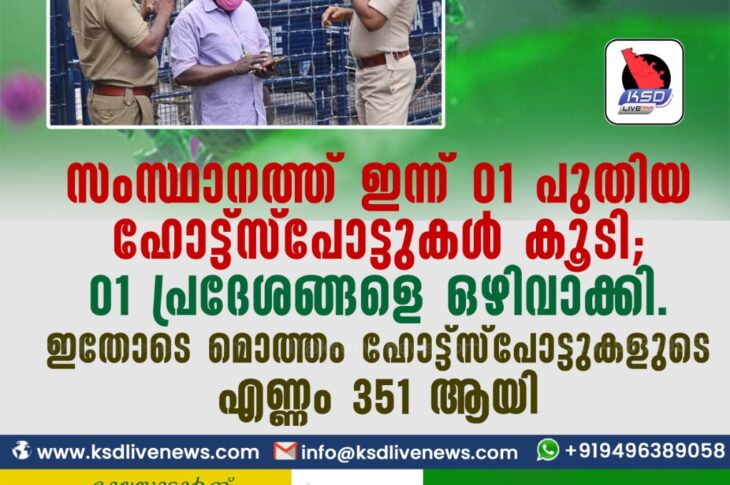 കേരളംകോവിഡ് 19 സംസ്ഥാനത്ത് ഇന്ന് 01 പുതിയ ഹോട്ട്സ്പോട്ടുകള് കൂടി; 01 പ്രദേശങ്ങളെ ഒഴിവാക്കി. ഇതോടെ മൊത്തം ഹോട്ട്സ്പോട്ടുകളുടെ എണ്ണം 351 ആയി.March 13, 2021