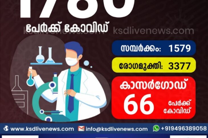 കേരളംകോവിഡ് 19 സംസ്ഥാനത്ത് ഇന്ന് 1780 പേർക്ക് കോവിഡ് സ്ഥിരീകരിച്ചു. സമ്പർക്കം വഴി 1579 പേർക്കും ; ആശ്വാസമായി 3377 പേർക്ക് രോഗ മുക്തിയും ; കാസർഗോഡ് ജില്ലയിൽ 66 പേർക്ക് പുതിയ കോവിഡ് കേസുകൾ ; മരണം 14March 12, 2021