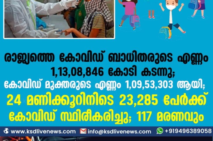കോവിഡ് 19ദേശീയം രാജ്യത്തെ കോവിഡ് ബാധിതരുടെ എണ്ണം 1,13,08,846 കടന്നു ; കോവിഡ് മുക്തരുടെ എണ്ണം 1,09,53,303 ആയി;24 മണിക്കൂറിനിടെ 23,285 പേർക്ക് കോവിഡ് സ്ഥിരീകരിച്ചു ; 117 മരണവുംMarch 12, 2021