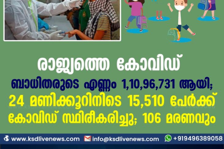 കോവിഡ് 19ദേശീയംപ്രാദേശികം രാജ്യത്തെ കോവിഡ് ബാധിതരുടെ എണ്ണം 1,10,96,731 കടന്നു ;24 മണിക്കൂറിനിടെ 15,510 പേർക്ക് കോവിഡ് സ്ഥിരീകരിച്ചു ; 106 മരണവുംMarch 1, 2021