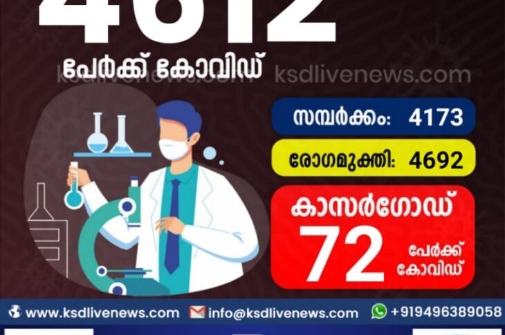 കേരളംകോവിഡ് 19 സംസ്ഥാനത്ത് ഇന്ന് 4612 പേർക്ക് കോവിഡ് സ്ഥിരീകരിച്ചു. സമ്പർക്കം വഴി 4173 പേർക്കും ; ആശ്വാസമായി 4692 പേർക്ക് രോഗ മുക്തിയും ; കാസർഗോഡ് ജില്ലയിൽ 72 പേർക്ക് പുതിയ കോവിഡ് കേസുകൾ ; മരണം 15February 14, 2021