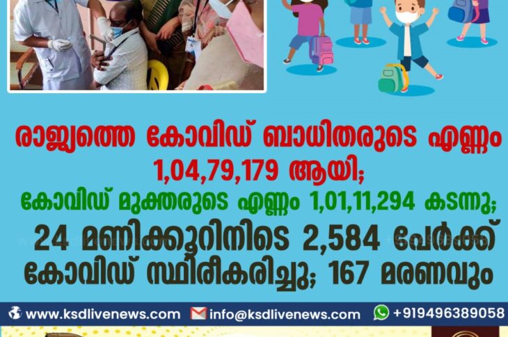 കോവിഡ് 19ദേശീയം രാജ്യത്തെ കോവിഡ് ബാധിതരുടെ എണ്ണം 1,04,79,179 ആയി ; കോവിഡ് മുക്തരുടെ എണ്ണം 1,01,11,294 കടന്നു ;24 മണിക്കൂറിനിടെ 12,584 പേർക്ക് കോവിഡ് സ്ഥിരീകരിച്ചു ; 167 മരണവുംJanuary 12, 2021