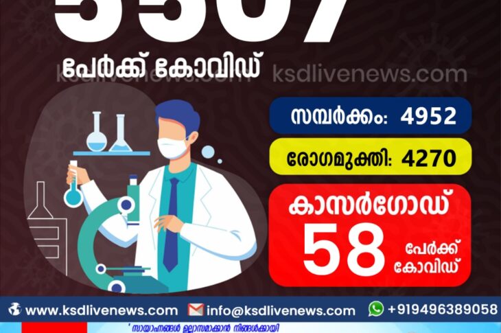 കേരളംകോവിഡ് 19 സംസ്ഥാനത്ത് ഇന്ന് 5507 പേർക്ക് കോവിഡ് സ്ഥിരീകരിച്ചു. സമ്പർക്കം വഴി 4952 പേർക്കും ; ആശ്വാസമായി 4270 പേർക്ക് രോഗ മുക്തിയും ; കാസർഗോഡ് ജില്ലയിൽ 58 പേർക്ക് പുതിയ കോവിഡ് കേസുകൾ ; മരണം 25January 12, 2021