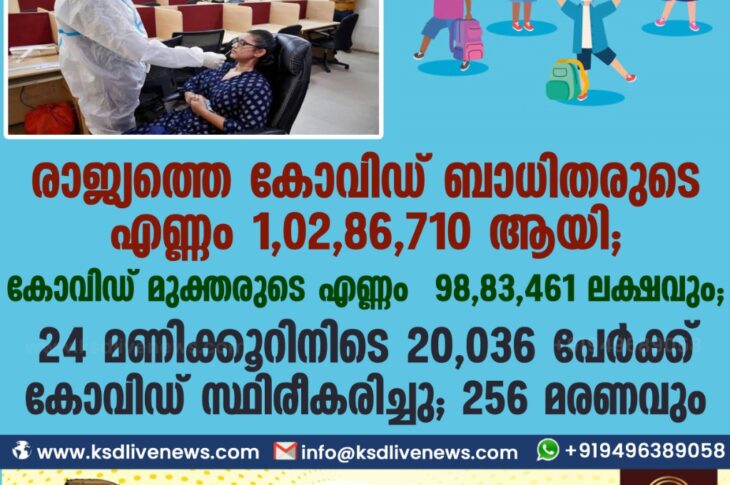 കോവിഡ് 19ദേശീയം രാജ്യത്തെ കോവിഡ് ബാധിതരുടെ എണ്ണം 1,02,86,710 ആയി ; കോവിഡ് മുക്തരുടെ എണ്ണം 98,83,461 ലക്ഷവും ;24 മണിക്കൂറിനിടെ 20,036 പേർക്ക് കോവിഡ് സ്ഥിരീകരിച്ചു ; 256 മരണവുംJanuary 1, 2021