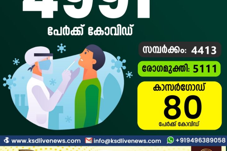 കേരളംകോവിഡ് 19 സംസ്ഥാനത്ത് ഇന്ന് 4991 പേർക്ക് കോവിഡ് സ്ഥിരീകരിച്ചു. സമ്പർക്കം വഴി 4413 പേർക്കും ; ആശ്വാസമായി 5111 പേർക്ക് രോഗ മുക്തിയും ; കാസർഗോഡ് ജില്ലയിൽ 80 പേർക്ക് പുതിയ കോവിഡ് കേസുകൾ ; മരണം 23January 1, 2021