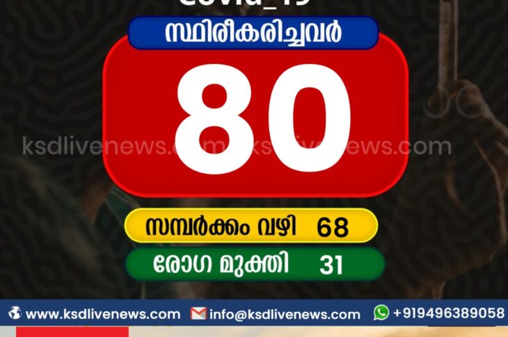 കാസർഗോഡ്കോവിഡ് 19 കാസർഗോഡ് ജില്ലയിൽ ഇന്ന് 80 പേർക്ക് കോവിഡ് സ്ഥിരീകരിച്ചു. സമ്പർക്കം വഴി 68 പേർക്കും. 31 പേർക്ക് രോഗമുക്തിJanuary 1, 2021