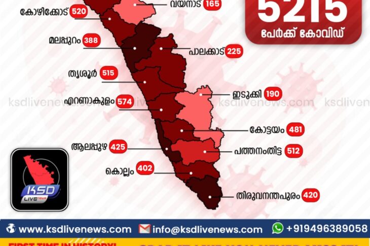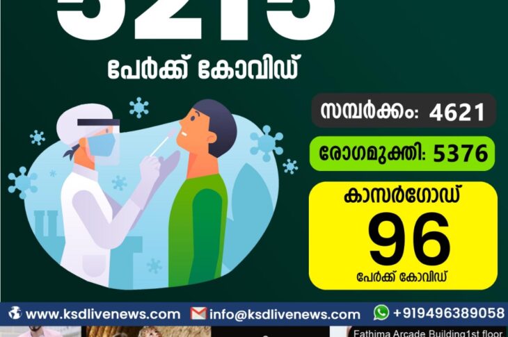 സംസ്ഥാനത്ത് ഇന്ന് 5215 പേർക്ക് കോവിഡ് സ്ഥിരീകരിച്ചു. സമ്പർക്കം വഴി 4621 പേർക്കും ; ആശ്വാസമായി 5376 പേർക്ക് രോഗ മുക്തിയും ; കാസർഗോഡ് ജില്ലയിൽ 96 പേർക്ക് പുതിയ കോവിഡ് കേസുകൾ ; മരണം 27