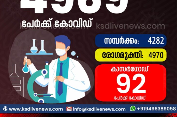 കേരളംകോവിഡ് 19 സംസ്ഥാനത്ത് ഇന്ന് 4969 പേർക്ക് കോവിഡ് സ്ഥിരീകരിച്ചു. സമ്പർക്കം വഴി 4282 പേർക്കും ; ആശ്വാസമായി 4970 പേർക്ക് രോഗ മുക്തിയും ; കാസർഗോഡ് ജില്ലയിൽ 92 പേർക്ക് പുതിയ കോവിഡ് കേസുകൾ ; മരണം 27December 17, 2020
