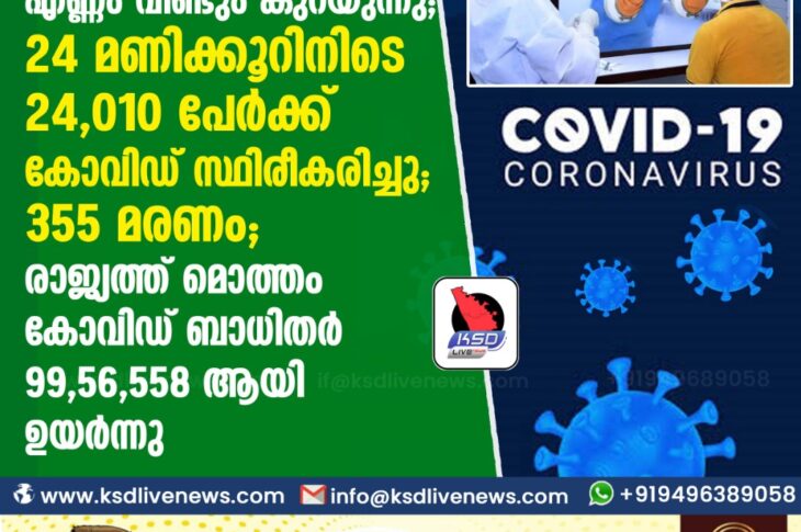 കോവിഡ് 19ദേശീയം രാജ്യത്തെ പ്രതിദിന കോവിഡ് ബാധിതരുടെ എണ്ണം വീണ്ടും കുറയുന്നു ;24 മണിക്കൂറിനിടെ 24,010 പേർക്ക് കോവിഡ് സ്ഥിരീകരിച്ചു ; 355 മരണം ; രാജ്യത്ത് മൊത്തം കോവിഡ് ബാധിതർ 99,56,558 ആയി ഉയർന്നുDecember 17, 2020