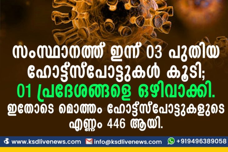 കേരളംകോവിഡ് 19 സംസ്ഥാനത്ത് ഇന്ന് 03 പുതിയ ഹോട്ട്സ്പോട്ടുകള് കൂടി; 01 പ്രദേശങ്ങളെ ഒഴിവാക്കി. ഇതോടെ മൊത്തം ഹോട്ട്സ്പോട്ടുകളുടെ എണ്ണം 446 ആയി.December 6, 2020