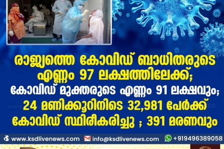 കോവിഡ് 19ദേശീയം രാജ്യത്തെ കോവിഡ് ബാധിതരുടെ എണ്ണം 97 ലക്ഷത്തിലേക്ക് ; കോവിഡ് മുക്തരുടെ എണ്ണം 91 ലക്ഷവും ;24 മണിക്കൂറിനിടെ 32,981 പേർക്ക് കോവിഡ് സ്ഥിരീകരിച്ചു ; 391 മരണവുംDecember 7, 2020