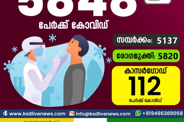 കേരളംകോവിഡ് 19 സംസ്ഥാനത്ത് ഇന്ന് 5848 പേർക്ക് കോവിഡ് സ്ഥിരീകരിച്ചു. സമ്പർക്കം വഴി 5137 പേർക്കും ; ആശ്വാസമായി 5820 പേർക്ക് രോഗ മുക്തിയും ; കാസർഗോഡ് ജില്ലയിൽ 112 പേർക്ക് പുതിയ കോവിഡ് കേസുകൾ ; മരണം 32December 5, 2020