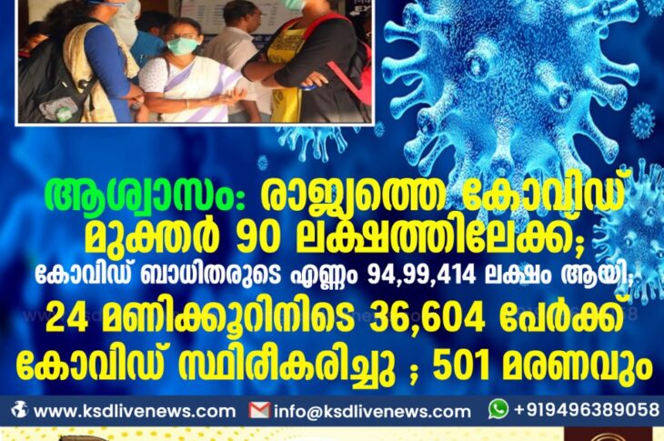 കോവിഡ് 19ദേശീയം ആശ്വാസം: രാജ്യത്തെ കോവിഡ് മുക്തർ 90 ലക്ഷത്തിലേക്ക് ; കോവിഡ് ബാധിതരുടെ എണ്ണം 94,99,414 ലക്ഷം ആയി ;24 മണിക്കൂറിനിടെ 36,604 പേർക്ക് കോവിഡ് സ്ഥിരീകരിച്ചു ; 501 മരണവുംDecember 2, 2020