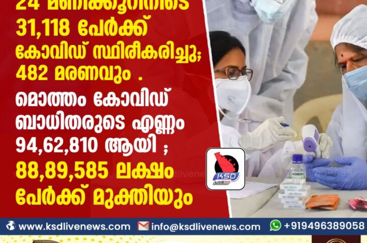 കോവിഡ് 19ദേശീയം രാജ്യത്തെ കോവിഡ് വ്യാപനം കുറയുന്നു :24 മണിക്കൂറിനിടെ 31,118 പേർക്ക് കോവിഡ് സ്ഥിരീകരിച്ചു ; 482മരണവും .മൊത്തം കോവിഡ് ബാധിതരുടെ എണ്ണം 94,62,810 ആയി ; 88,89,585 ലക്ഷം പേർക്ക് മുക്തിയുംDecember 1, 2020