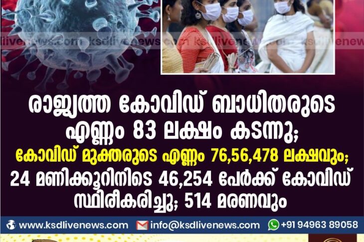 കോവിഡ് 19ദേശീയം രാജ്യത്ത കോവിഡ് ബാധിതരുടെ എണ്ണം 83 ലക്ഷം കടന്നു ; കോവിഡ് മുക്തരുടെ എണ്ണം 76,56,478 ലക്ഷവും ;24 മണിക്കൂറിനിടെ 46,254 പേർക്ക് കോവിഡ് സ്ഥിരീകരിച്ചു ; 514 മരണവുംNovember 4, 2020