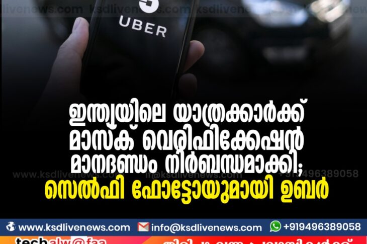 കോവിഡ് 19ദേശീയം ഇന്ത്യയിലെ യാത്രക്കാർക്ക് മാസ്ക് വെരിഫിക്കേഷൻ മാനദണ്ഡം നിർബന്ധമാക്കി ; സെൽഫി ഫോട്ടോയുമായി ഉബർOctober 19, 2020