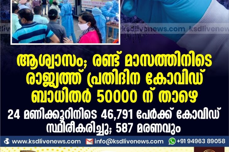 കോവിഡ് 19ദേശീയം ആശ്വാസം രണ്ട് മാസത്തിനിടെ രാജ്യത്ത് പ്രതിദിന കോവിഡ് ബാധിതർ 50000 ന് താഴെ24 മണിക്കൂറിനിടെ 46,791 പേർക്ക് കോവിഡ് സ്ഥിരീകരിച്ചു ; 587 മരണവുംOctober 20, 2020