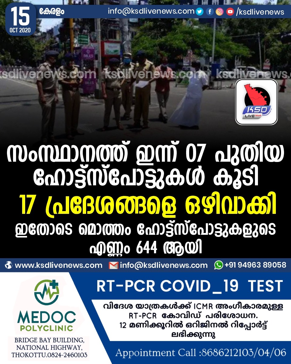 കേരളംകോവിഡ് 19 സംസ്ഥാനത്ത് ഇന്ന് 07 പുതിയ ഹോട്ട്സ്പോട്ടുകള് കൂടി; 17 പ്രദേശങ്ങളെ ഒഴിവാക്കി.ഇതോടെ മൊത്തം ഹോട്ട്സ്പോട്ടുകളുടെ എണ്ണം 644 ആയി.October 15, 2020