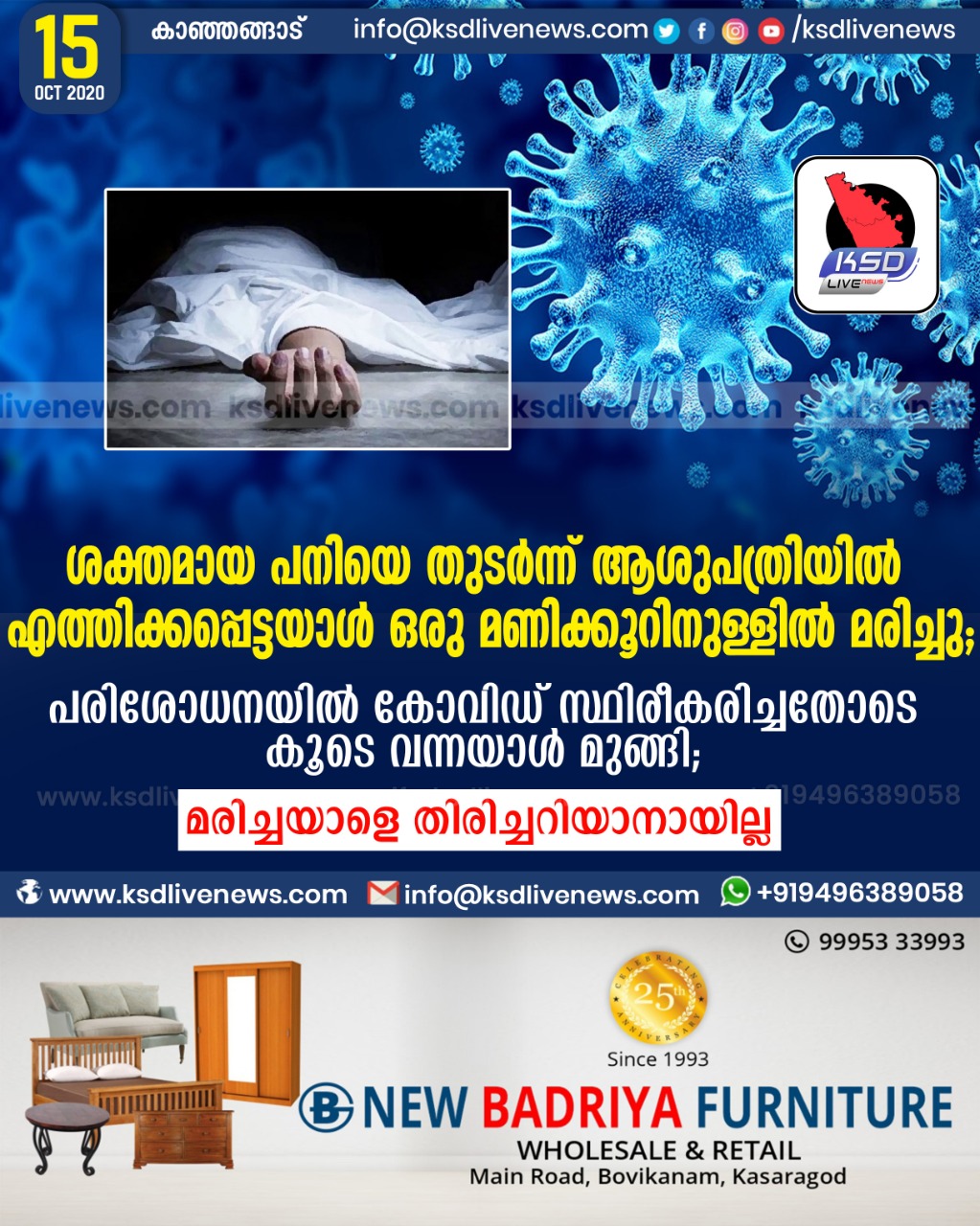 കോവിഡ് 19പ്രാദേശികം ശക്തമായ പനിയെ തുടർന്ന് ആശുപത്രിയിൽ എത്തിക്കപ്പെട്ടയാൾ ഒരു മണിക്കൂറിനുള്ളിൽ മരിച്ചു; പരിശോധനയിൽ കോവിഡ് സ്ഥിരീകരിച്ചതോടെ കൂടെ വന്നയാൾ മുങ്ങി; മരിച്ചയാളെ തിരിച്ചറിയാനായില്ലOctober 15, 2020