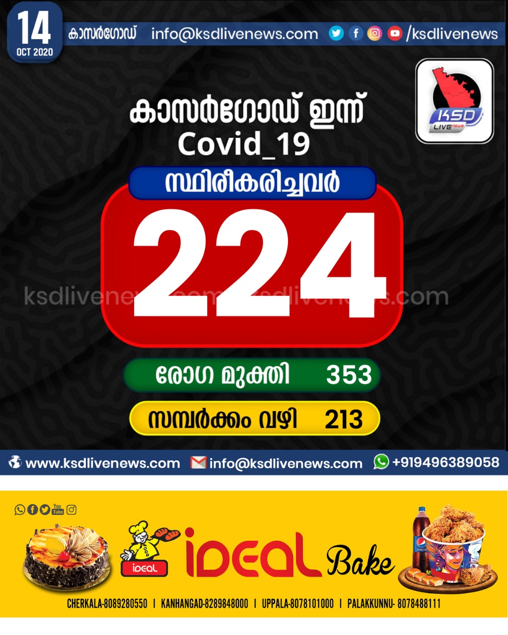 കോവിഡ് 19പ്രാദേശികം കാസർഗോഡ് ജില്ലയിൽ ഇന്ന് 224 പേർക്ക് കോവിഡ് സ്ഥിരീകരിച്ചു. സമ്പർക്കം വഴി 213 പേർക്കും. 353 പേർക്ക് രോഗ മുക്തിOctober 14, 2020