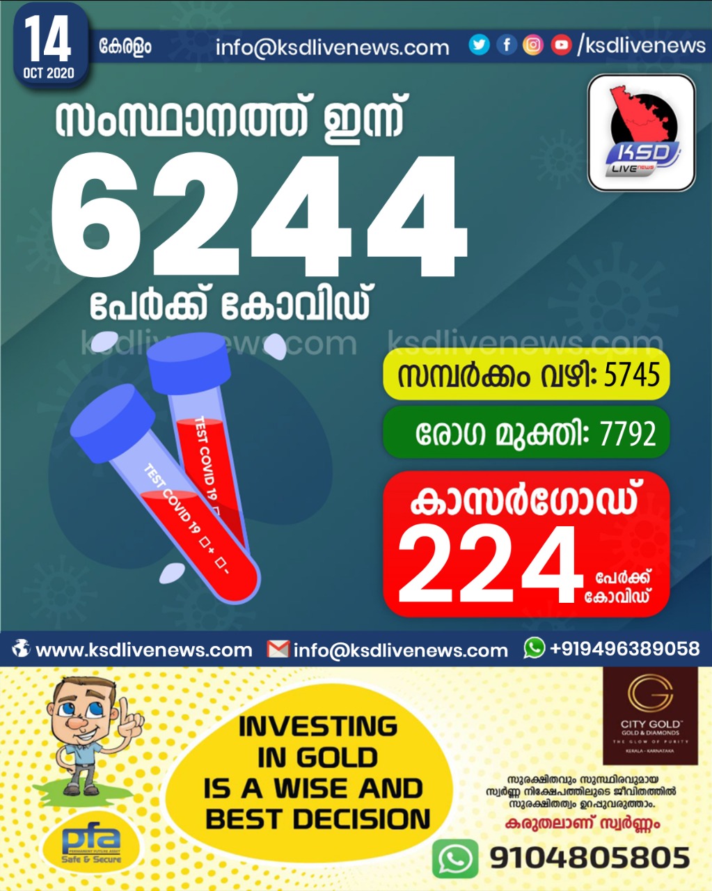കേരളംകോവിഡ് 19 സംസ്ഥാനത്ത് ഇന്ന് 6244 പേർക്ക് കോവിഡ് സ്ഥിരീകരിച്ചു. സമ്പർക്കം വഴി 5745 പേർക്കും.രോഗ മുക്തി 7792 പേർക്കും. കാസർഗോഡ് ജില്ലയിൽ ഇന്ന് 224 പേർക്ക് കോവിഡ് സ്ഥിരീകരിച്ചു. മരണം 20October 14, 2020