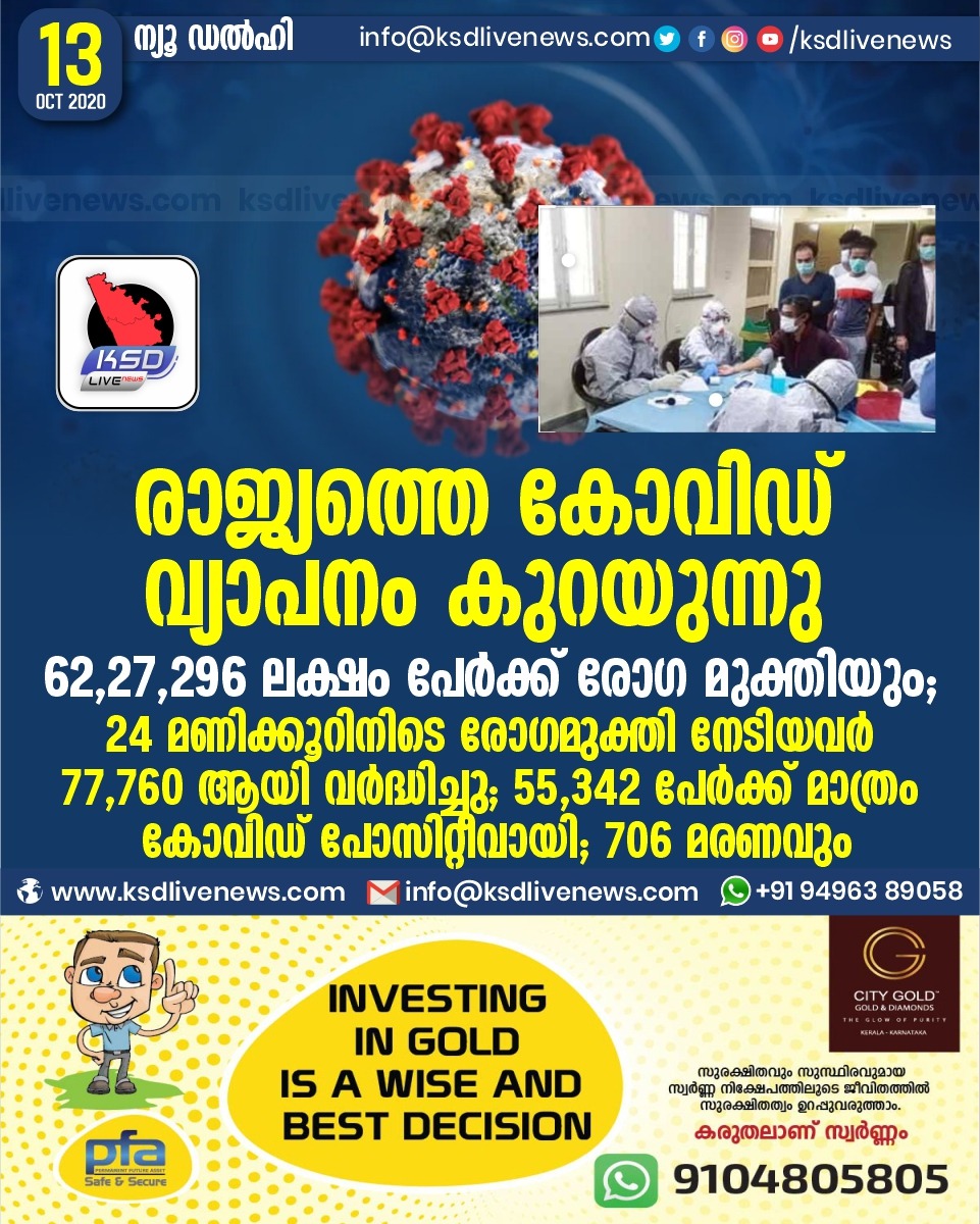 കോവിഡ് 19ദേശീയം രാജ്യത്തെ കോവിഡ് വ്യാപനം കുറയുന്നു ; 62,27,296 ലക്ഷം പേർക്ക് രോഗ മുക്തിയും ;24 മണിക്കൂറിനിടെ രോഗമുക്തി നേടിയവർ 77,760 ആയി വർദ്ധിച്ചു ; 55,342 പേർക്ക് മാത്രം കോവിഡ് പോസിറ്റീവായി ; 706 മരണവുംOctober 13, 2020