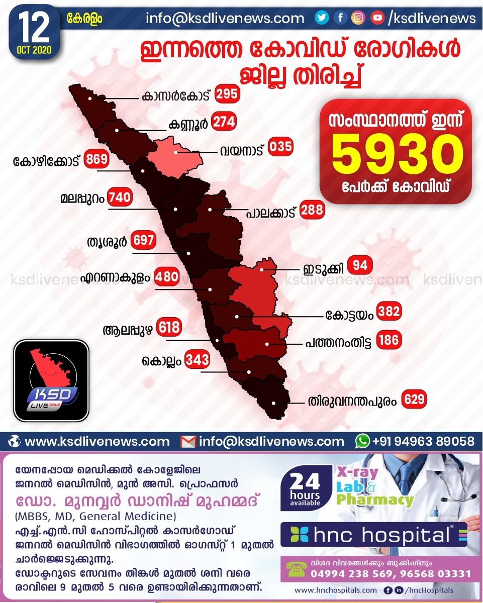കേരളംകോവിഡ് 19 സംസ്ഥാനത്ത് ഇന്ന് കോവിഡ് പോസിറ്റീവായരുടെ ജില്ല തിരിച്ചുള്ള സ്ഥിതി വിവരങ്ങൾOctober 12, 2020