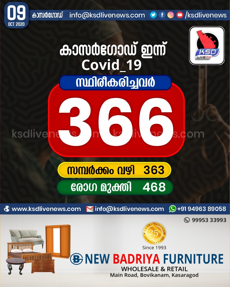 കോവിഡ് 19പ്രാദേശികം കാസർഗോഡ് ജില്ലയിൽ ഇന്ന് 366 പേർക്ക് കോവിഡ് സ്ഥിരീകരിച്ചു. സമ്പർക്കം വഴി 363 പേർക്കും. 468 പേർക്ക് രോഗ മുക്തിOctober 9, 2020