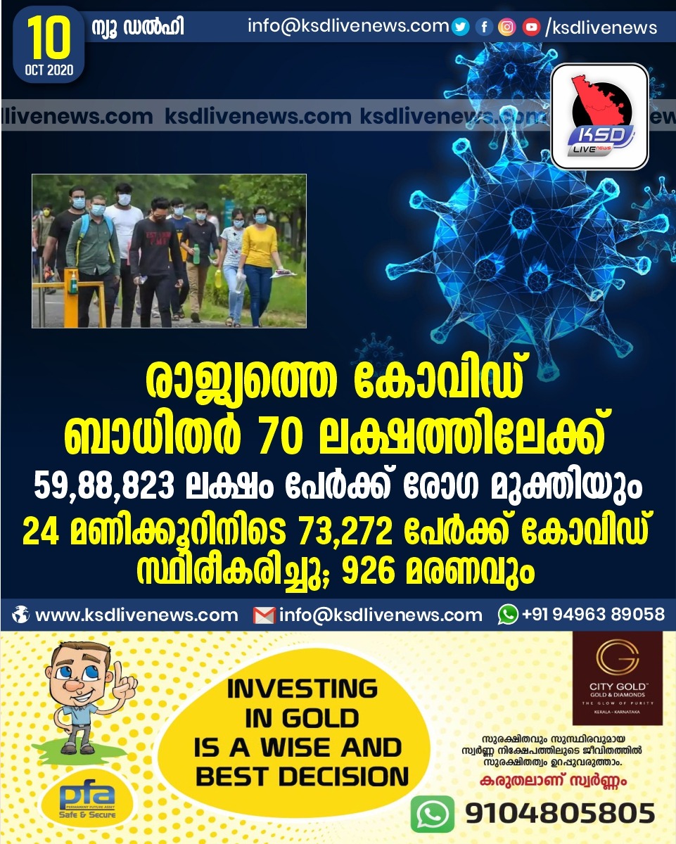 കോവിഡ് 19ദേശീയം രാജ്യത്തെ കോവിഡ് ബാധിതർ 70 ലക്ഷത്തിലേക്ക് : 59,88,823 ലക്ഷം പേർക്ക് രോഗ മുക്തിയും24 മണിക്കൂറിനിടെ 73,272 പേർക്ക് കോവിഡ് സ്ഥിരീകരിച്ചു ; 926 മരണവുംOctober 10, 2020