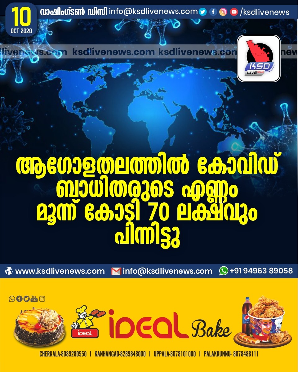 കോവിഡ് 19വിദേശം ആഗോളതലത്തില് കോവിഡ് ബാധിതരുടെ എണ്ണം മൂന്ന് കോടി 70 ലക്ഷവും പിന്നിട്ടു.October 10, 2020