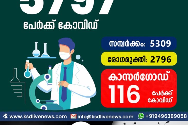 കേരളംകോവിഡ് 19 സംസ്ഥാനത്ത് ഇന്ന് 5797 പേർക്ക് കോവിഡ് സ്ഥിരീകരിച്ചു. സമ്പർക്കം വഴി 5309 പേർക്കും ; ആശ്വാസമായി 2796 പേർക്ക് രോഗം; കാസർഗോഡ് ജില്ലയിൽ 116 പേർക്ക് പുതിയ കോവിഡ് കേസുകൾ ; മരണം 19January 10, 2022