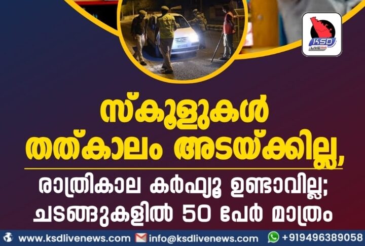 കേരളംകോവിഡ് 19വിദ്യാഭ്യാസം സ്കൂളുകള് തത്കാലം അടയ്ക്കില്ല, രാത്രികാല കര്ഫ്യൂ ഉണ്ടാവില്ല; ചടങ്ങുകളില് 50 പേര് മാത്രംJanuary 10, 2022