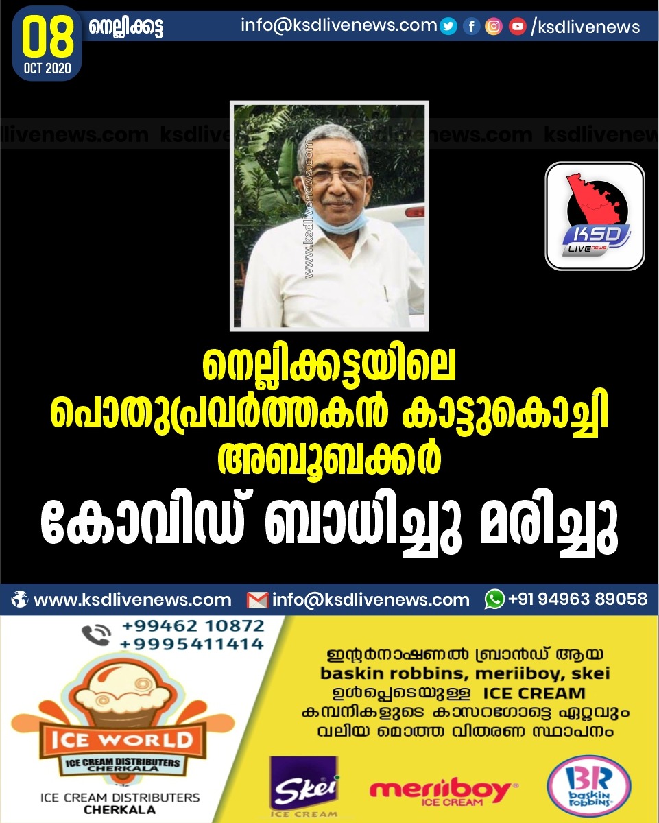 കോവിഡ് 19പ്രാദേശികം നെല്ലിക്കട്ടയിലെ പൊതുപ്രവർത്തകൻ കാട്ടുകൊച്ചി അബൂബക്കർ കോവിഡ് ബാധിച്ചു മരിച്ചുOctober 8, 2020