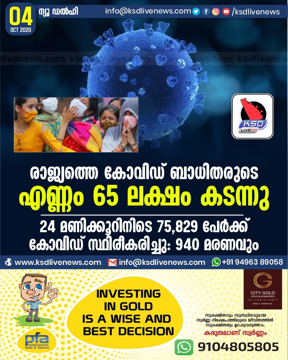 കോവിഡ് 19ദേശീയം രാജ്യത്തെ കോവിഡ് ബാധിതരുടെ എണ്ണം 65 ലക്ഷം കടന്നു ;24 മണിക്കൂറിനിടെ 75,829 പേർക്ക് കോവിഡ് സ്ഥിരീകരിച്ചു : 940 മരണവുംOctober 4, 2020