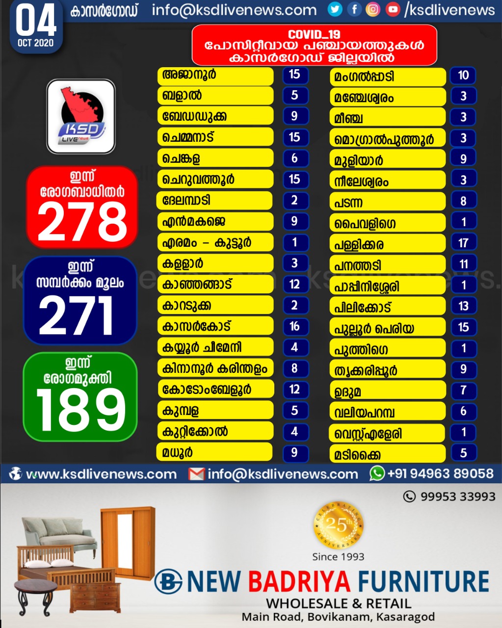 കോവിഡ് 19പ്രാദേശികം കാസർഗോഡ് ജില്ലയിൽ ഇന്ന് കോവിഡ് പോസിറ്റീവായവരുടെ പഞ്ചായത്ത് തിരിച്ചുള്ള സ്ഥിതി വിവര കണക്ക്October 4, 2020