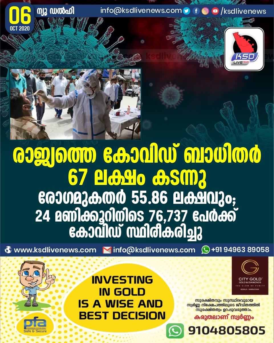 കോവിഡ് 19ദേശീയം രാജ്യത്തെ കോവിഡ് ബാധിതർ 67 ലക്ഷം കടന്നു ; രോഗമുകതർ 55.86 ലക്ഷവും ;24 മണിക്കൂറിനിടെ 76,737 പേർക്ക് കോവിഡ് സ്ഥിരീകരിച്ചുOctober 6, 2020