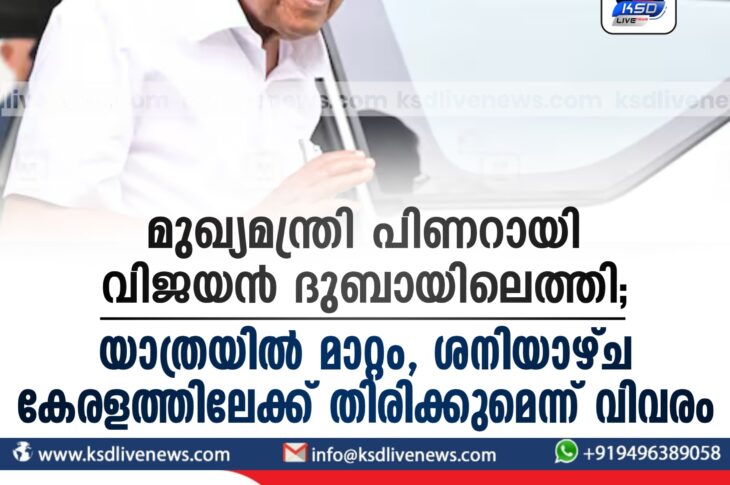 ഗൾഫ് മുഖ്യമന്ത്രി പിണറായി വിജയൻ ദുബായിലെത്തി; യാത്രയിൽ മാറ്റം, ശനിയാഴ്ച കേരളത്തിലേക്ക് തിരിക്കുമെന്ന് വിവരംMay 15, 2024
