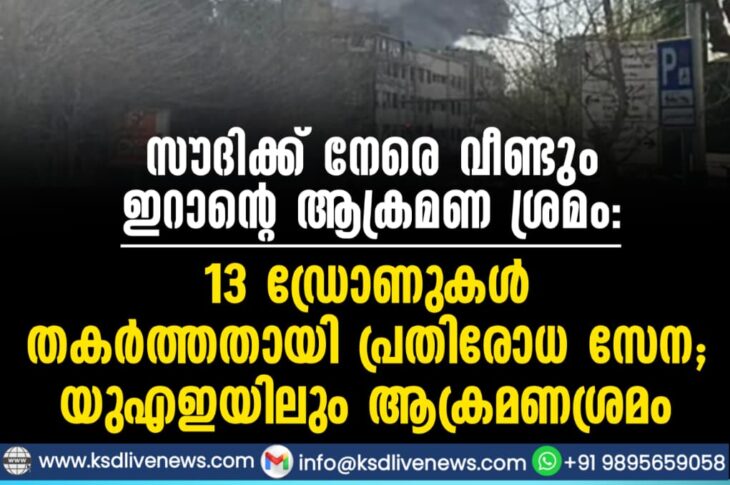 ഗൾഫ് സൗദിക്ക് നേരെ വീണ്ടും ഇറാന്റെ ആക്രമണ ശ്രമം; 13 ഡ്രോണുകള് തകര്ത്തതായി പ്രതിരോധ സേന; യുഎഇയിലും ആക്രമണശ്രമംMarch 23, 2026