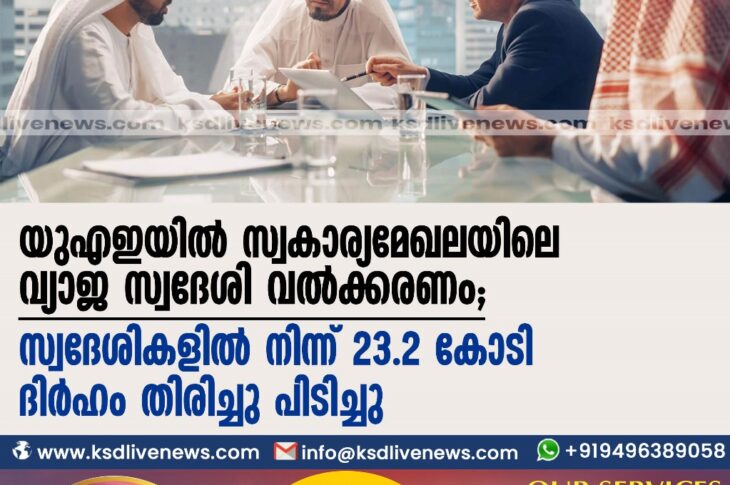 ഗൾഫ് യുഎഇയിൽ സ്വകാര്യമേഖലയിലെ വ്യാജ സ്വദേശിവൽക്കരണം; സ്വദേശികളിൽ നിന്ന് 23.2 കോടി ദിർഹം തിരിച്ചു പിടിച്ചുAugust 10, 2023