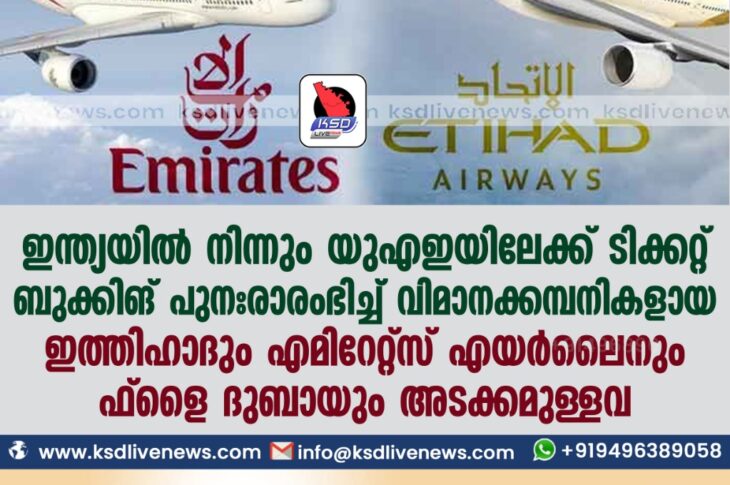 ഗൾഫ് ഇന്ത്യയില് നിന്നും യുഎഇയിലേക്ക് ടിക്കറ്റ് ബുക്കിങ് പുനഃരാരംഭിച്ച് വിമാനക്കമ്പനികളായ ഇത്തിഹാദും എമിറേറ്റ്സ് എയര്ലൈനും ഫ്ളൈ ദുബായും അടക്കമുള്ളവJuly 10, 2021